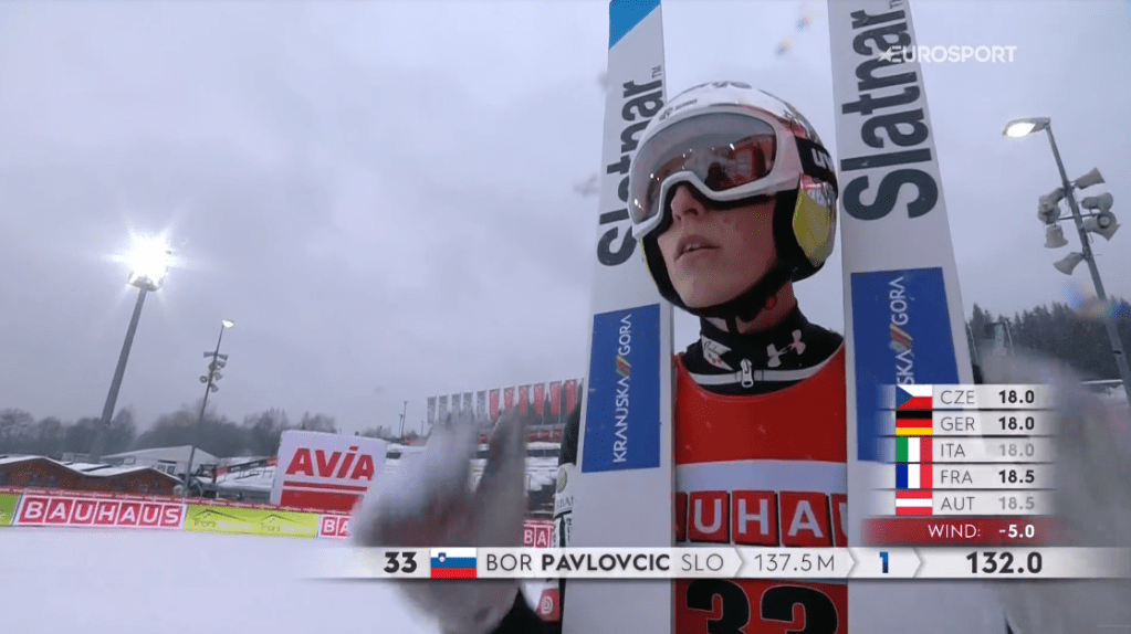 Anze Lanisek (5.) következett, aki 131 méterrel éppen Kubacki elé tudott beférni. Ezzel ő végül leszorult a dobogóról, viszont ami az egyik szlovénnak elszalasztott lehetőséget, az a másiknak dobogót ért, hiszen ezzel továbbra is Pavlovcic vezetett, aki két ugrással a vége előtt már élete első top3-mas eredményét ünnepelhette.