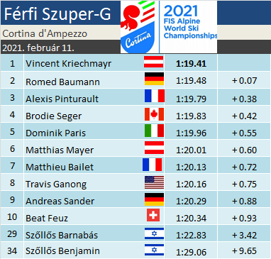 Az októberben 30. életévét betöltő Vincent Kriechmayr világbajnoki éremkollekciója kiteljesedett. A linzi lesikló két éve ezüstérmet szerzett ebben a szakágban, emellett lesiklásból van egy bronza. A kétszeres világbajnok Stephan Eberharter (1991 és 2003), valamint Hermann Maier (1999) és Hannes Reichelt (2015) után ő a negyedik osztrák, akinek győznie sikerült Szuper-G-ben. Három VK- futamot nyert az elmúlt egy év leforgása alatt, vezeti a szakági pontversenyt, így tulajdonképp érvényesítette a papírformát.