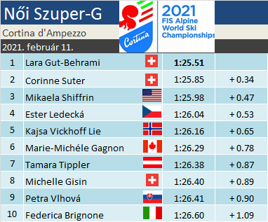 Lara Gut-Behrami hosszú világversenyes pechszériát zárt le világbajnoki címével szuper-G-ben. A svájci toronymagas favoritként utazott Cortinára, és ez cseppet sem zavarta meg, ugyanolyan elánnal síelt végig, ahogy az elmúlt hónapokban. A svájciak örömét tovább növelte, hogy Corinne Suter ezüstérme révén kettős győzelmet ünnepelhetnek. A címvédő Mikaela Shiffrin az idei szezonban először síelt versenykörülmények közt a szakágban, de két nagy hibával együtt is dobogóra tudott állni.