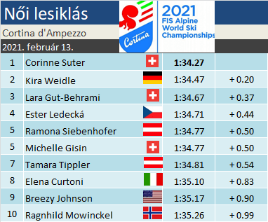 Corinne Suter révén újabb svájci aranyérem született Cortinán. A lesikló kis kristálygömb tavalyi győztese remek alsó szakasszal biztosította be a győzelmét. A svájciak csapatszinten is ismét remekeltek, Lara Gut-Behrami bronzéremmel gyarapította éremkollekcióját, így már mindkét svájci lány duplázott Cortinán a dobogón. Közéjük Kira Weidle férkőzött be remek teljesítménnyel, így a német válogatott három verseny alatt már most felülmúlta teljes világbajnoki várakozásukat az érmeket tekintve. A címvédő Ilka Štuhec mindössze a 14. helyen végzett.