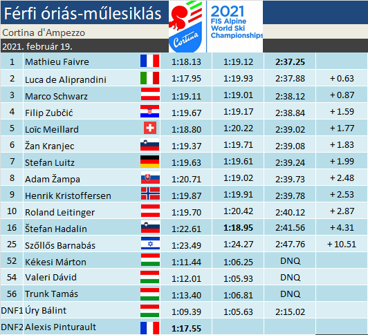 Fordulatokban bővelkedő zárás után Mathieu Faivre a negyedik helyről előretörve szerezte meg az óriás-műlesiklás világbajnoki címét! A második futamban betliztek az addigi dobogósok, így Pinturault és Schmid is kiesett, egyedül Luca de Aliprandini őrizte meg második helyét, meglepetés ezüsttel örvendeztetve meg az olaszokat. A harmadik helyet Marco Schwarz szerezte meg, így az osztrákok abból a számból is éremmel távoznak, ahol a legkevesebb eséllyel kalkuláltak előzetesen. Szőllős Barnabás újabb remek eredménnyel, 25. helyével vétette észre magát ismét!