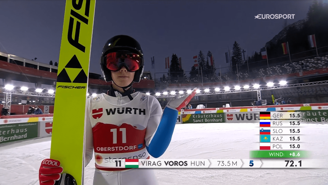 A kvali előtti próbasorozatban 71 méterrel éppen negyvenedik volt Virág, úgy, hogy az egyik nagy esélyes, Sara Takanashi kihagyta a gyakorlást, vagyis az előzmények alapján igencsak izgalmas egy órára készülhettünk a kvalifikáció alatt és hát ebben nem is csalódtunk. Virág 11-es rajtszámmal ugrott, ezen a sáncon leghosszabb, 73,5 méteres kísérletével ekkor az ötödik helyet foglalta el a táblázaton, és innentől kezdődött a várakozás és a számolgatás. 18 versenyzőt követően elsőként a kanadai Abigail Strate örülhetett a továbbjutásnak, majd ahogy jöttek a többiek szép lassan Virág neve is egyre közelebb került a kvalifikáltak csoportjához, előbb még öt ugrót kellett maga mögé utasítania, aztán négyet, hármat, kettőt, egyet… de az utolsó előzés csak nem akart összejönni. Versenyzőnk végül három tizeddel maradt le a 75 métert ugró 40. Natalie Eliers mögött, ezzel a 41. helyen végzett, így bár nagyon kevésen múlt, de nem lehet ott a holnapi versenyen. Alighanem ebben a helyzetben sovány vigaszt jelent, hogy ez az eredmény így is a legjobbja eddig a világbajnokságokon. Viszont rendeznek még egy nagysáncos versenyt is, habár Virág saját bevallása szerint ott várt előzetesen kevesebbet magától, hátha ott jobban rámosolyog a szerencse.