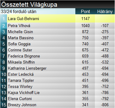 Összetettben Gut-Behrami tovább növelte előnyét az élen, immár átlépte a lélektani 100 pontos határt. Előnye 107 pont Vlhová előtt, míg Gisin lemaradása már 175 pont. Gutnak elsősorban a hátralévő 4 szlalom miatt kell építenie előnyét a szlovákkal szemben.