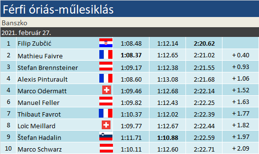 Filip Zubčić harmadik győzelmét aratta a Világkupában. Mostani sikerének értékét növeli, hogy az előző kettővel ellentétben ma nem szakadó hóesésben kellett bizonyítania. Mathieu Faivre közel járt ahhoz, hogy világbajnoki címe után a VK-ban is sikerüljön végre nyernie – több mint 4 év elteltével. Hetedik alkalommal végzett dobogós pozícióban. Idén pedig először. Stefan Brennsteiner, közel a harminchoz, nem tartozott az osztrák válogatott oszlopos tagjai közé. Azért is meg kellett küzdenie, hogy egyáltalán kiutazhasson a vb-re. Versenyén helyezetlenül zárt, ma viszont kiváló délelőtti menetével nagyot húzott. Csak ma több VK- pontot gyűjtött, mint bármelyik szezonjában együttvéve. Legjobb eredményét idén Adelbodenben érte el, akkor nyolcadikként zárt. Osztrák óriás-műlesiklóként legutóbb Hirscher végzett dobogón, épp két éve, ugyanúgy Banszkón.
