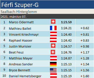 Marco Odermatt az utolsó utáni pillanatban győzelemmel tartotta meg összetettbeli esélyeit, ma ugyanis 90 ponton belülre zárkózott Pinturault-ra a saalbachi szuper-G-n. Karrierje legjobbjával Matthieu Bailet szerezte meg a második helyet. A szuper-G éllovasa, Vincent Kriechmayr ezzel a harmadik helyre szorult, így a szakági bajnokavatás ma elmaradt. A verseny bővelkedett fordulatokban, 30-on túl is záporoztak a top10-es sízések. A mezőny harmada pedig kiesett a trükkös pályán, de szerencsére komolyabb sérülés nélkül úszta meg mindenki.