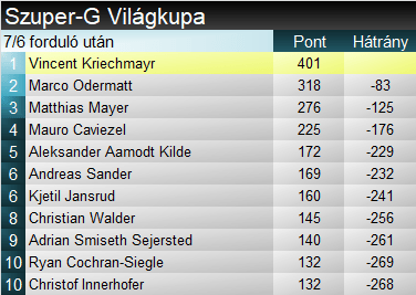Vincent Kriechmayr (3.) rendkívül kontrollált, rontás nélküli futamot síelt, viszont a trükkös szakasz előtt nagyot fékezett a jó ívekért cserébe. A folytatásban a tempóval viszont nem volt gond, a pálya végén hagyott benne viszont újabb tizedeket.