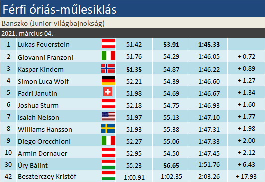 A múlt csütörtökön sorra került óriás-műlesiklás hozta meg az első magyar sportsikert a junior-világbajnokságon. A még ifjúsági korú Úry Bálint végzett élen az U18-as kategóriában, a tiszteletére csendült fel a magyar himnusz Banszkón. Összevetésben a 30. helyen zárt Bálint. Osztrákhoz vándorolt a vb-cím, Lukas Feuerstein egy átütő erejű délutáni futammal fordította a maga javára a versenyt a legnagyobb esélyesként kezelt Giovanni Franzonival szemben.