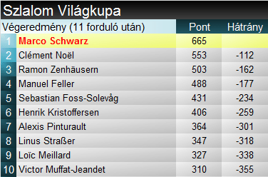 A szakági pontversenyt Marco Schwarz már Kranjska Gorán megnyerte, Clément Noël viszont megelőzte Ramon Zenhäusernt, aki idén először esett ki. A svájci a dobogóról viszont nem csúszott le, így Yule idei gyengélkedése ellenére is van ismét svájci a szakági dobogó, korábbi „lyukas számukban”.