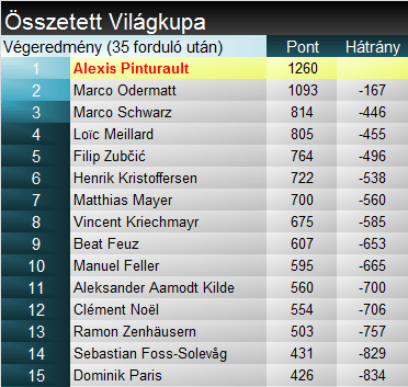 Az összetettben Pinturault és Odermatt helye már biztos volt az első két helyen, míg Loïc Meillard nem tudott elég pontot hozni Marco Schwarzon, így utóbbi megtartotta a harmadik helyet, a svájci a negyedik helyen végzett. Nem lenne meglepő, ha a következő szezonokban látnánk még őket is előrébb ranglistán. A szakági és összetett legjobbakról a jövő héten még részletesebben is foglalkozunk!