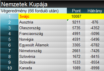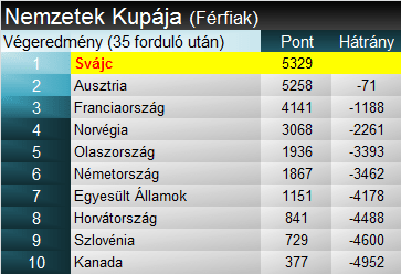 A nemzetek kupájában ugyan Zenhäusern kiesésekor még úgy tűnt, Ausztria az utolsó utáni pillanatban fordíthatja meg a férfi pontversenyt, végül Pertl és Schwarz nagy hibái révén a svájciak előnye végül alig csökkent. Összességében pedig már a verseny előtt tudni lehetett, hogy Svájc nyeri tavaly után idén is a Nemzetek kupáját, ezúttal viszont a férfi összesítés mellett a nőiben sem akadt senki, aki felülmúlta volna őket.