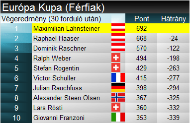 A nőkkel ellentétben a férfiaknál a gyors számokból is sikerült bőven versenyt rendezni, így az összetett Európa-kupa győztese a lesiklásban 2., szuper-G-ben 4., óriásban is pontokat szerző osztrák Maximilian Lahnsteiner lett. A teljes osztrák dobogót letarolták az osztrákok, a minden szakágban pontot szerző, de elsősorban szintén a gyorsabbik háromban helytálló Raphael Haaser végzett a második helyen, míg technikai síző, az óriásban szakági győztes Dominik Rascher lett a harmadik. Mögöttük két svájci, a szuper-G legjobbjai, Stefan Rogentin és Ralph Weber végeztek, majd a lesiklás bajnoka, Victor Schuller következett.