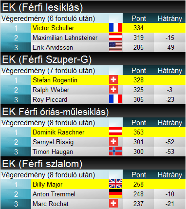 A szuper-G tabella élén ismerős neveket taláunk, Stefan Rogentint és Ralph Webert sem kell bemutatni a rendszeres VK-nézőknek, minden gyorsasági versenyen rajthoz állnak. A francia Roy Piccard-t is többször ott találjuk a legrangosabb versenyek rajtlistáin is, de ő egyelőre az EK-ban vitézkedik elsősorban. Nyert versenyt az EK összetett győztese, Maximilian Lahnsteiner is, valamint két további svájci fiatal, Josua Mettler és Lars Rösti is.