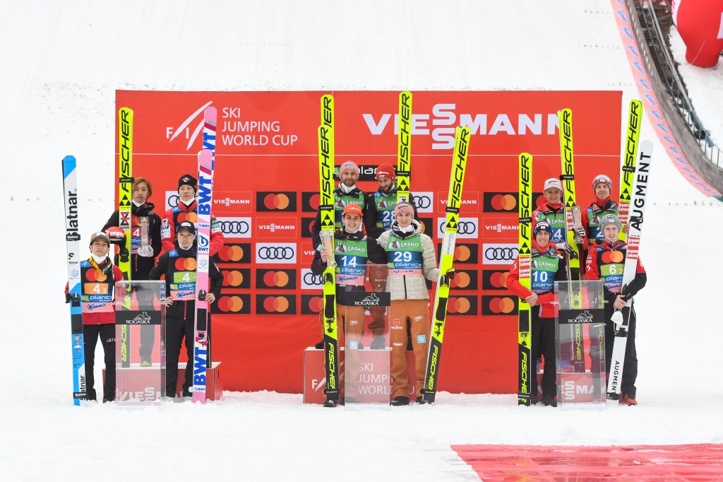 Németország Pius Paschke (218 m) és Constantin Schmid (212 m) ugrásai után csak a 4. helyen állt. A harmadik csoportban azonban Markus Eisenbichler 235,5 méteres ugrásának köszönhetően – aki edzői döntés értelmében alacsonyabb beülőből indulhatott – Németország átvette a vezetést. Az utolsóként ugró, és jó formában lévő Karl Geiger 220,5 méterrel pedig megtartotta a németek számára az első helyet.