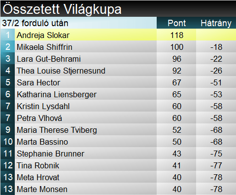 Andreja Slokar a tavalyi szezonban már többször megvillant a szlalomok második futamaiban, nemegyszer végzett a legjobbak mögött a top10-ben. Thea Louise Stjernesund a feltörekvő norvég generáció tagja, 3 top10-es eredményt követően állhatott dobogóra. Kristin Lysdahl 9 top10-es eredmény után épp a 10. alkalommal végzett először a dobogón.