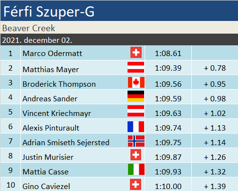 Marco Odermatt egyre inkább cáfolja azt a tézist, hogy a rutin és az évek teszik igazán jóvá a gyorssízőt. Alig múlt 24 éves, mégis a fő esélyesek közt tarthatjuk számon nemcsak szuper-G-ben, de óriásban és összetettben is. 76. Világkupa-versenyén 15. dobogóját és 6. győzelmét szerezte meg. Matthias Mayer idénykezdete alapján nagyon úgy tűnik, ebben a szezonban az osztrák csapaton belül tényleg ő a májer. 196. versenyén 38. dobogóját szerezte meg. A különbséget elnézve a mostani versenyből kihozta az elérhető maximumot a 31 éves afritzi síző. A dobogó meglepetése Broderick Thompson jelenléte. Sokan értek el jó eredményt a top-30 legvégén, vagy nem sokkal azután indulva, vélhetően javultak kissé a körülmények a pálya középső részén, de ez semmit nem von le a 27 éves kanadai érdemeiből. 48. Világkupa-versenyén begyűjtötte élete első dobogóját.