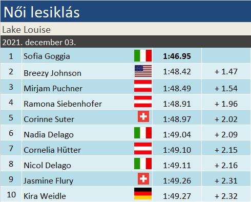 Sofia Goggia behúzta tehát a 12. győzelmét a Világkupában, a kilencediket lesiklásban. Olybá tűnik, ott folytatja, ahol bukása előtt abbahagyta. Kimagaslik a mezőnyből, olyan fokú kockázatot nem vállal be senki, mint ő. Ha megússza sérülés nélkül, gyaníthatóan idén se nagyon lesz ellenfele. Breezy Johnsonra sem lehet panasz, hiszen karriercsúccsal felérő második helyezést szerzett. Az előző idényben négy zsinórban gyűjtött harmadik pozíció után tegnap feljebb lépett eggyel. Mirjam Puchner ismert arról, hogy míg az esetek többségében eltűnik a homályban, néha teljesen meglepő menetekre képes. Ezúttal ez nem ért győzelmet, az viszont bíztatóbb, hogy a kimagasló szereplés először nem a Világkupa-fináléhoz kötődött.