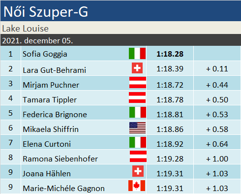 Sofia Goggia 14. győzelmét aratta, a negyediket szuper-G-ben. Sofia Goggia előtt legutóbb Mikalea Shiffrin tudott egy triplahétvégét tökéletes mérleggel zárni, 2016 végén, Semmeringen. Ugyanebben az évben triplázott utoljára Lake Louise korábbi királynője, Lindsey Vonn. Lara Gut-Behrami 27. dobogóját szerezte szuper-G-ben, amivel beérte a női örökranglista harmadikját, Katja Seizingert. Már csak Vonn és Götschl vannak előtte 46, illetve 41 dobogóval. Mirjam Puchner eddig dobogó után jellemzően a pontszerzéssel is küzdött, ezúttal viszont a pénteki dobogó és a tegnapi top10 után ismét dobogóra állhatott. Puchnertől ez egyébként szuper-G-ben hatalmas meglepetés, eddig ugyanis egyszer, 2 éve épp itt Lake Louise-ban végzett top10-ben a kanyargósabbik gyorsszámban.