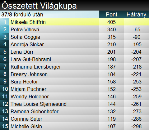 Mikaela Shiffrin (6.) a hétvége utolsó verseny szépíteni tudta az eddigi gyengébb lesiklásokat. A kanyargós részeken végig a dobogósokkal küzdött, végül a pálya végi sebesség hiányzott, amivel ezt megszerezhette volna. A legjobbak sorát előbb Priska Nufer kaputévesztése majd Christine Scheyer tempóhiányos menete zárta.