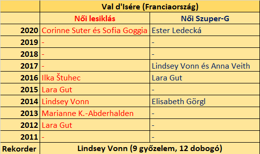 Val d’Isére csúcstartója természetesen nem más, mint Lindsey Vonn. Összesen kilencszer győzött ott, beleértve 2009-es vb-dupláját is.