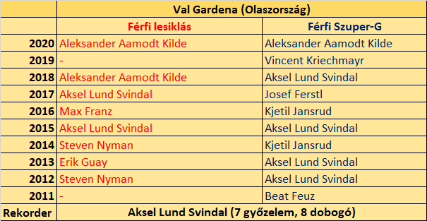Val Gardenát is leuralták az utóbbi években a norvégok. Az előző 5 versenyből négyet ők nyertek, Szuper-G-ből még félelmetesebb a 10-ből 8 arány. Alexander Aamodt Kilde a kétszeres címvédő, vagyis egy újabb sikerrel beérheti Klammert: