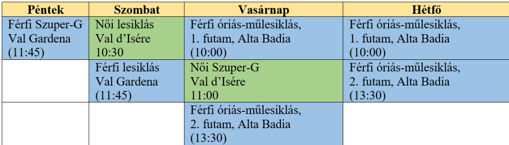 Karácsony közeledtével mindinkább felgyorsulnak az események a Világkupában. Az elkövetkező hat napban öt különböző helyszínen kilenc versenyt rendeznek. Az átláthatóság végett mi két blokkra szedtük a menetrendet, ebben a cikkben a férfiak Val Gardena-i és Alta Badia-i, ill. a nők Val d’Isére-i versenyeire fogunk koncentrálni. Minden más hétfő esti összesítésünkben szerepel majd.