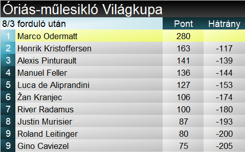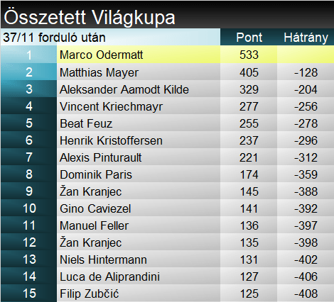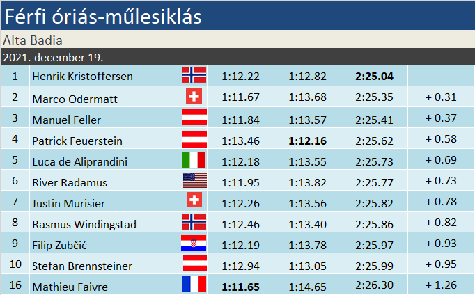 Henrik Kristoffersen 24. győzelmét aratta a Világkupában, ebből az ötödiket szerezte óriás-műlesiklásban. A hosszabbik szakágban két év után győzött újra, ismételten Alta Badián. Kíváncsian várjuk, hogy valóban túllépett-e a felszerelést illető krízisen, avagy a fene nagy elégedettség csak a sikeres napból fakadt-e nála? Marco Odermatt immáron tucatnyi dobogónál jár a szakágban, s megerősítette vezető helyét mindkét tabellán. Manuel Feller tízedik pódiumát szerezte összességében.