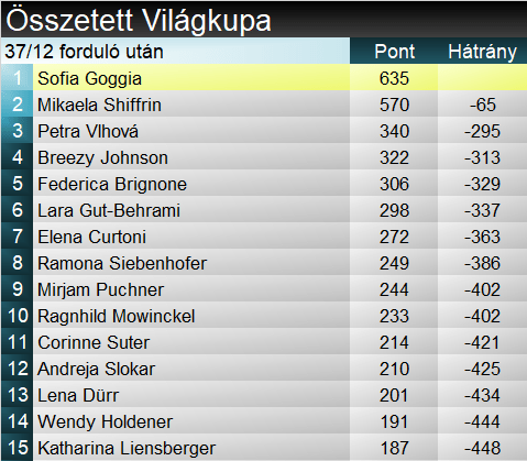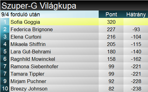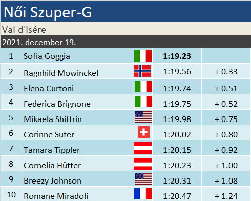 Továbbra is érinthetetlen Sofia Goggia, ami a gyorsszámokat illeti. Val d’Isère-ben kiköszörülte a csorbát és már szuper-G-ben is győzelmet aratott. Ezúttal sem sok hiányzott a hármas olasz győzelemhez, Goggia mögött egy ideig Elena Curtoni és Federica Brignone álltak a pillanatnyi dobogón, de Ragnhild Mowinckel sérülése utáni első top hármas helyezését szerezte, letaszítva ezzel a pódiumról Fede’-t.
