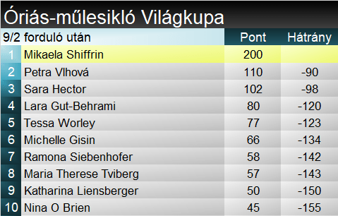 Mikaela Shiffrin karrierje 72. sikerét aratta, óriásban pedig a 14.-et. Ezzel a szakági örökranglistán beérte Morerodot, Wachtert, Mazét, Rebensburgot és Worleyt, és már csak ketten, Annamarie Moser-Pröll (16) és Vreni Schneider (20) állnak előtte, ami a nőket illet. Ami pedig az összetettet illeti, Shiffrin visszavette az összetett vezetést a ma nullázó Goggiától, és szakágiban is tetemes előnnyel rendelkezik, mindössze két versenyt követően.