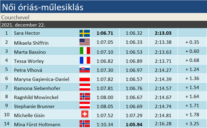 Jóval szorosabb küzdelmet hozott a második courcheveli óriás-műlesiklás, mint a tegnapi. Mikaela Shiffrinnek pedig nem jött össze a duplázása, hiszen bár mindkét futamán odatette magát, hiányzott ma belőle a frissesség. Sara Hector pedig tegnapi dobogója után új impulzusokra tett szert, és kétségek nélkül nyerte – hét év elteltével – karrierje második Világkupa-versenyét. A szakág címvédője, Marta Bassino két nullázás után kezdi összerakni magát, egy dobogó formájában jelezte, rá is számítani kell. Olasz részről több örömre nem volt ok: Goggia az első, Brignone a második futamban búcsúzott. Az osztrákok erős napot zártak, mivel hét sízőjük is bejutott a délutáni futamba, s közülük kettő a TOP-10 között zárt.