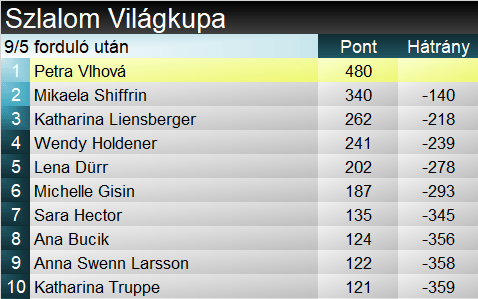 A szakági világkupában Vlhová előnye már 140 pont Shiffrin, és több mint 200 pont Liensberger előtt. Összetettben Shiffrin továbbra is az élen, 100 pont feletti előnnyel, de a második helyen jelenleg már Petra Vlhová van, aki megelőzte Sofia Goggiát.