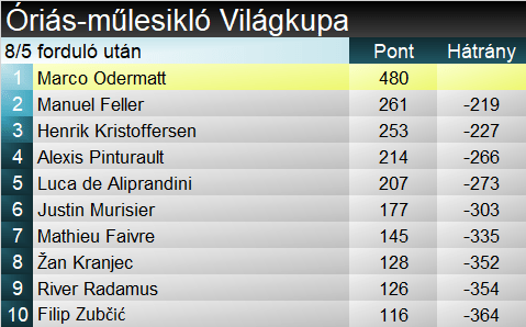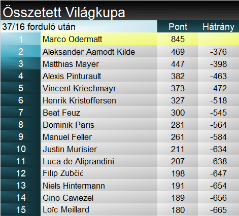 Ami a szakágit illeti, Odermatt fölényesen vezet, és minden bizonnyal már Kranjska Gorán eldönti a kis kristálygömb sorsát. Összetetten is tovább növelte előnyét, nem nagyon látszik, ki tudná őt megfogni a hátralévő időben.