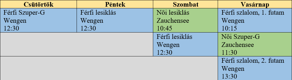 A schladmingi női szlalom másnapján rögtön jelentkezünk szokott előzetesünkkel, hiszen tartalmas napok előtt állunk. Mindkét nem esetén átlépünk a Világkupa-idény második felébe, míg a nők a január eleji ausztriai lesikló hetüket síelik, a férfiak erőt próbáló napok előtt állnak. Csütörtökön az előbb Lake Louise-ból, majd Bormióból elhalasztott Szuper-G-t pótolják, hogy aztán kétszer is végig síeljék a Lauberhornt, ha a melegfront engedni fogja. Vasárnap pedig a szintén klasszikusnak számító szlalommal fejeződik be a hétvégi program.