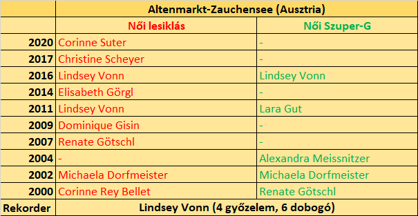 Azóta azért kijutott a dicsőségből az osztrákoknak is, két évre rá például Dorfmeister duplázott, de utóbb Götschl is behúzott egy lesiklást. Nagy titkot nem árulunk el azzal, hogy Lindsey Vonn a lejtő legeredményesebb sízője. Egy-egy kombináció és Szuper-G mellett kétszer nyert a királykategóriában. Alábbiakban 2011-es csúszása tekinthető meg.