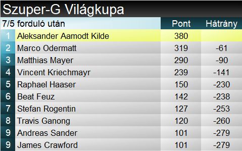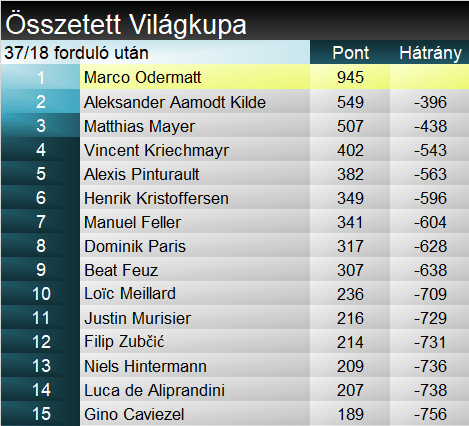 A szakági világkupában két versennyel a vége előtt 61 pontos előnye van Kildének Odermatt előtt, míg Mayer lemaradása már 90 pont. Legközelebb viszont csak márciusban folytatódik a harc a kis kristálygömbért, Kvitfjellben. Összetettben Odermatt előnye tetemes, 396 pont, Kilde előtt. Mayer itt is 3., 438 pontos lemaradásban.