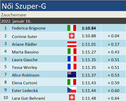 Érdekes módon, miközben kedvenc számában, óriás-műlesiklásban leginkább csak szenved, Szuper-G-ben már másodjára győzött idén Federica Brignone. Ez a 18. sikere a Világkupában, amivel beérte az örökranglista 25. helyén álló kettőst, Anita Wachtert és Tamara McKinneyt. Corinne Suter ezen a télen másodjára, összességében tizennyolcadik alkalommal zárt dobogós helyen. A 26 éves Ariane Rädler – a háta mögött három súlyos térdsérüléssel – mindössze második teljes VK- idényét teljesíti. Második TOP10-helyezése egyben élete első dobogóját jelentette, amivel gyaníthatóan bebiztosította olimpiai indulását.