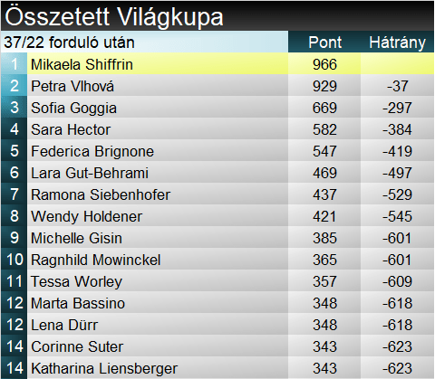 Sűrűsödött az állás mind a szakágiban, mind összetettben. Előbbiben három olasz áll az első három helyen, de Gut-Behrami végső sikere is bőven benne van a pakliban. Ami az összetettet illeti, Vlhová, ha nem is pontdömpinggel, de valamicskét közelített Shiffrinre.