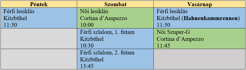 A január az alpesi síelés ünnepi heteit hozza el a szurkolók számára. A klasszikusoknak azonban, mint minden jónak, egyszer csak vége szakad, az elkövetkező napokban Kitzbühellel, majd a schladmingi Nachtslalommal függesztik fel a fiúk a Világkupát, hogy a kerettagok aztán elutazzanak Pekingbe, az olimpiai játékok helyszínére. Az előttünk álló hétvége csúcseseménye az időjárás-előrejelzés nyomán vasárnapra tolt Hahnenkammrennen lesz a kegyetlenségéről ismeretes Streifen, ám a szombaton látható szlalom is tartogat még izgalmakat – ha más téren nem, akkor a kerethirdetés tekintetében mindenképpen. Eközben a hölgyek szintén emblematikus helyszínen, a cortinai Tofanán teljesítenek újabb gyorsasági hétvégét.