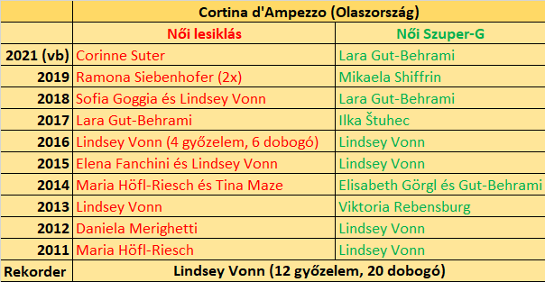 Eme rekord is csak arra várt, hogy megdöntse valaki. Ki más teljesítette volna ezt a feladatot, mint Lindsey Vonn?! Hat alkalommal verte a mezőnyt Cortinán, jellemzően toronymagasan. Mint az alábbi felvételen is látható.