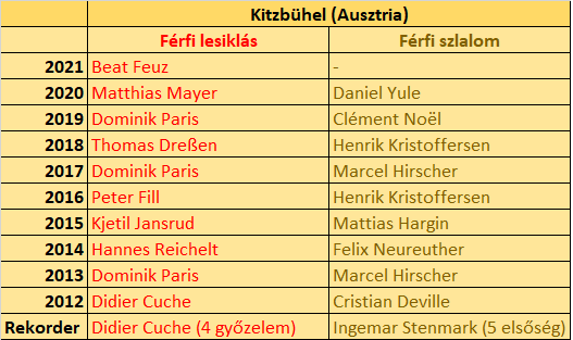 Tizenöt síző mondhatta el eddig magáról, hogy egynél többször meghódította a kitzbüheli lejtőt. Többek közt Zurbriggen, Heiner, Strobl és Eberharter is eljutott legalább a duplázásig. A lejtő rekordere az a Didier Cuche, aki anno négy alkalommal is betörte a Streifet. Öt éven belül, fagyban, enyhe időben, szikrázó napsütésben, borongós időben. Őt ezt nem szokta zavarni.
