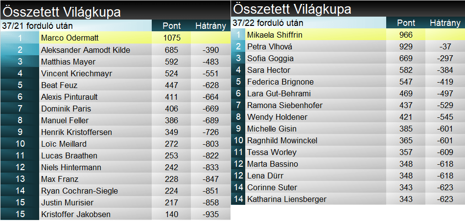Ne szépítsük, a férfiak összetett pontversenye – így, január derekára – eldőlt. Marco Odermatt olyan eksztatikus formában síel idén, amit bár bőven kinézett belőle a szakma, de talán inkább az évtized közepe tájékán várt tőle igazán. Jelenleg pedig úgy áll a helyzet, hogy a két korábbi szezonbajnoknak, Aleksander Aamodt Kildének és Alexis Pinturault-nak összesen alig van valamennyivel több pontja, mint a svájcinak. Odermatt kapcsán inkább az a fő kérdés, hogy ifjú sportolóként képes lehet-e arra, mit Hermann Maier összehozott az ezredfordulón, vagyis, hogy az óriás-műlesiklás mellett behúzza mindkét gyors számot?!