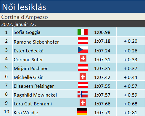 Sofia Goggia idei 6. sikerét aratta, míg összességében 17-nél tart már. A zauchenseei meglepő nullázást leszámítva továbbra sem talált legyőzőre a leggyorsabb szakágban. Úgy tűnik Ramona Siebenhofer a legjobbkor lendül csúcsformába, múlt héten szuper-G-ben végzett a harmadik helyen. Az osztrák hetedik dobogós helyezését szerezte, ebből ez a harmadik Cortináról, és további kettő van még más olasz helyszínről. Ester Ledecká ezen a télen másodszor állt dobogóra Cortina d’Ampezzón, igaz, decemberben mindezt még snowboardon csúszva tette. A cseh síző alpesi síben 6. VK-dobogóját szerezte, idén viszont ez volt számára az első ilyen előkelő helyezés. Legutóbb alpesi sí VK-dobogón napra pontosan egy éve állt, a Crans-Montana-i lesikláson.