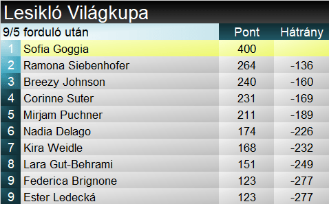 Összetettben Goggia 200 ponton belülre zárkózott az éllovas Shiffrinhez képest, holnap már rajthoz fog állni Szuper-G-ben. Goggia adott esetben akár komoly visszazárkózást is összehozhat a holnapi, illetve a jövő hétvégi garmischi versenyeken. Szakágiban Goggia magabiztosan vezet Siebenhofer előtt, előnye 136 pont.