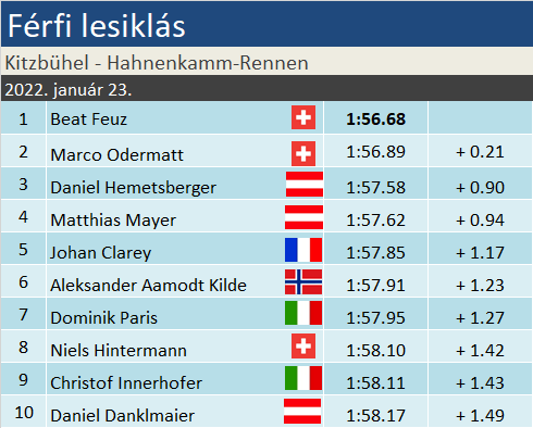 Beat Feuz sikerével zárult a mai lesiklás Kitzbühelben. A lassacskán a Streif legnagyobbjai közé emelkedő svájci mögött az összetettet uraló honfitársa, Marco Odermatt végzett, aki a traverzen dobta el a győzelmet. A házigazda osztrákok becsületét Daniel Hemetsberger mentette meg, aki dobogójával végképp megvette a jegyét Pekingbe. Mayer a 4., Kilde csak a 6., Paris a 7. helyen zárt. Bukás nélkül túlélte a mezőny a versenyt.