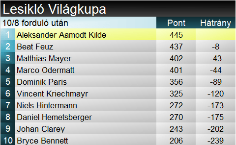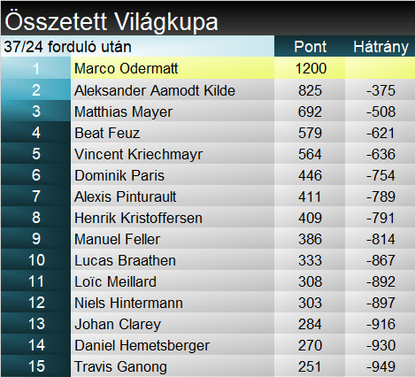 A lesikló Világkupában továbbra is sokesélyes a kristálygömbért folytatott küzdelem. Feuz 8 pontra megközelítette az élenálló Kildét, Odermatt egyetlen pontra a 3. helyen álló Mayert – és mindahányan 44 ponton belül vannak egymástól. Paris és Kriechmayr kissé leszakadni látszik, de matematikailag két versennyel a vége előtt még 8 síelő is odaérhet. Összetettben viszont lassacskán már számolgatni sem érdemes, Odermatt elképesztő formájára nem lehet ellenszere a mezőnynek.