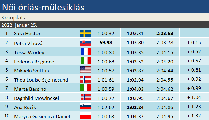 Sara Hector (1.) csúszására lassan szavak nincsenek. Annyira későn fékezett, mint senki más, fergeteges tempójába pedig még a hibák is belefértek. Közte egy nagyon komoly kisodródás a letörésnél. Már az bravúr volt, hogy egyáltalán be tudott fordulni. A Worley-Brigone páros vastapssal jutalmazta, amiért ezzel együtt is megverte őket a svéd. Mármint délután is. Petra Vlhovának (2.) tehát nem egy verhetetlen menettel szemben kellett volna megvédenie első helyét. Ám ehhez kockáztatnia kellett. Jól adagolta a tempót, így végig zöldülő szektorokhoz ért a záró szektorhoz, ahol viszont világosan elmaradt sebességben Hectortól. Brignone tehát leszorult a dobogóról. Emésztgessünk még egy tényt: nincs sem osztrák, sem svájci a legjobb tíz között óriás-műlesiklásban.