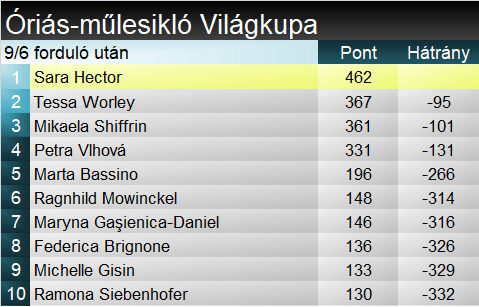 Túlzás lenne azt állítani, hogy Sara Hector a semmiből jött volna elő az idei évben, elvégre jó egy évtizede ott van a szakág bő krémjében. Na, de arra kevesen számítottunk, hogy az addig egyetlen VK- sikernél járó svéd jelenleg négynél tart, s az idei óriás-műlesikló versenyeken – egy kivétellel – mindig dobogóra vezetett az útja. Toronymagasan vezeti a szakágit. Vlhová a 12., míg Worley a 34. dobogóját ünnepelte ma óriásban.