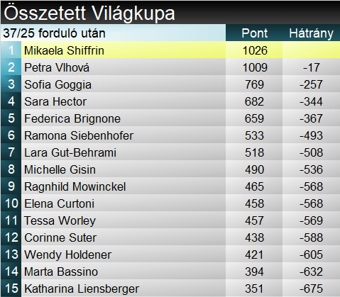 Sara Hector egyszerűen elnyűhetetlen idén. A svédek specialistája a szezon hatodik óriás-műlesiklásán harmadik győzelmét aratta, s egyben ötödik alkalommal végzett dobogós helyen. Nem csoda tehát, hogy már közel száz ponttal előzi meg a szakági összevetésben a ma harmadikként zárt Worley-t. Petra Vlhová végzett a második helyen, ami annyit jelent, hogy nagyon megközelítette az összetett éllovasát Shiffrint. Érdekesség még, hogy sem osztrák, sem svájci nő nem végzett a TOP10-ben.