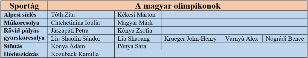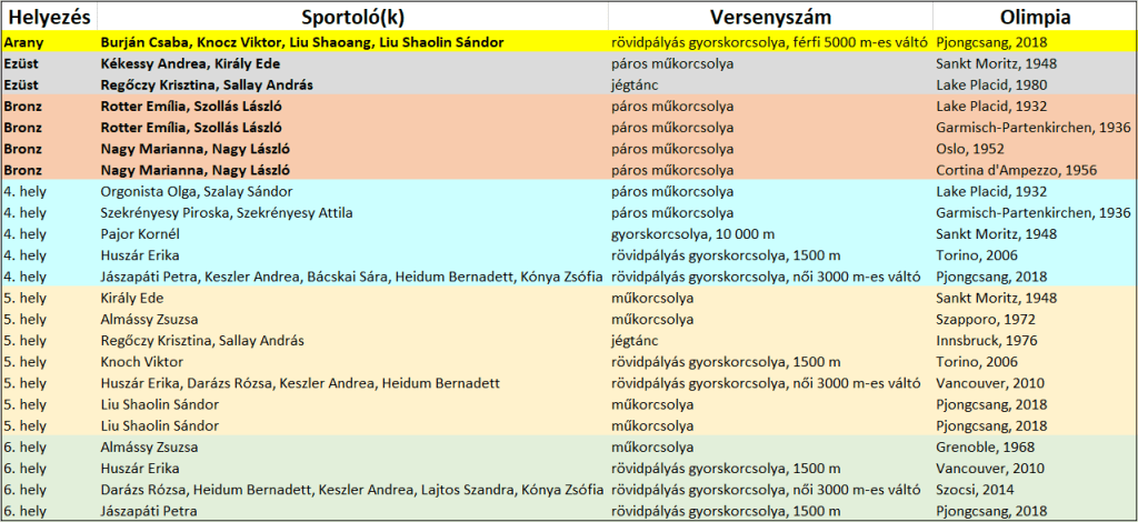 A magyar téli sport olimpiai szereplését az alábbi táblázatban összesítettük: