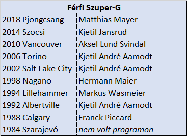 Osztrák sugallatra hozták létre a nyolcvanas évek folyamán, férfi fronton mégis norvég hegemóniát hozott eddig a technikai száguldás terepe, a szuperóriás-műlesiklás. A háromszoros olimpiai bajnok Kjetil André Aamodt után Vancouverben Svindal, Szocsiban némi meglepetésre Kjetil Jansrud nyert. Meglepetést persze leginkább azért jelentett, mert honfitársától, Svindaltól vártuk volna a norvég sikert… A skandinávok nagy sorozatát Mayer szakította meg négy éve Dél-Koreában. A Távol-Kelet akár jó ómen is lehet az osztrákoknak, hiszen a múlt század végén a Herminator Japánban nyert aranyat.