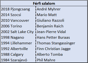 Tommaso Sala: kisebb meglepetésre szorított ki olyan, egyébként idén nem is rosszul síző olasz veteránokat, mint Mölgg és Gross (akiket most itt említünk meg, mert bár a legnagyobb hiányzók közé tartoznak jogosan, de oda végül mást választottunk). Mindezt úgy, hogy igen szűkös az olasz kvóta. Sala a szezon kezdete óta lépeget előre, Val-d’Isère-ben még 37-essel volt 12. Azóta már harmincból kap rajtszámot, és az utolsó két osztrák verseny karriercsúcsot jelentő 6. és 7. helyeket szerzett. Nem lenne meglepő, ha az idei dobogósok népes sorát a 25 éves milánói síző épp az olimpián gyarapítaná. Elvégre láttunk már idén szlalomban hasonlóan nagy meglepetést, nem is egyet…